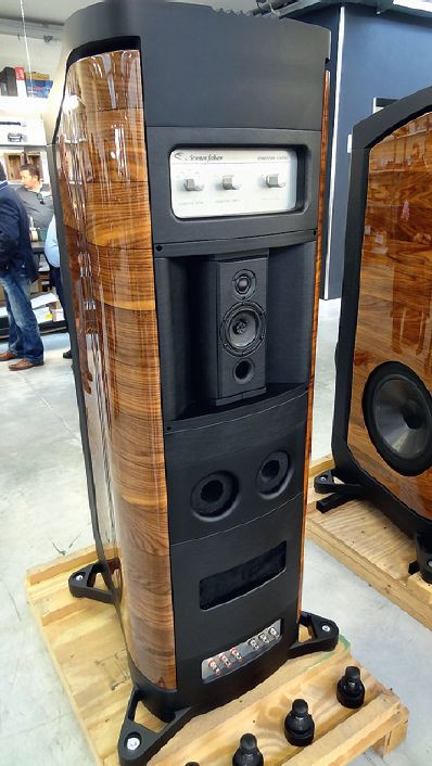 Dłużej przyglądać się też nie mogłem, bo za chwilę narzucili na kolumny wielkie worki, ujrzałem jednak coś, wielkie coś, na kształt i skalę modelu Aida, z wklęsłymi przednimi fragmentami boków, z otworem bas-refl eks w formie wielkiej szczeliny pod górną ścianką, promieniującej do tyłu, częściowo w kolorze Ferrari Red. Gdybym wtedy wiedział, że za chwilę to zasłonią, to bym się bardziej skupił na tym obiekcie i zapamiętał więcej szczegółów. Wiadomo więc tyle, że w Sonusie nie spoczywają na laurach, projektują nowe konstrukcje, i to takie, które mają nam po raz kolejny zapierać dech w piersiach.