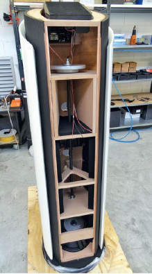 Do jakiej konstrukcji są te obudowy, nie odgadłem – może to zaczyn nowego modelu? Jeżeli leżą frontem do stołu, to przekrój obudowy, pod względem akustycznym, jest wyśmienity; duże zaokrąglenia za głośnikami i zwężająca się ku tyłowi komora