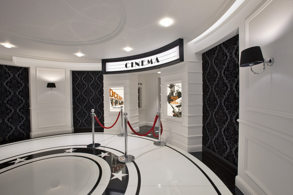 Jak wygląda sala kinowa? Składa się z trzech pomieszczeń. Pierwsze to wejście, które przypomina tradycyjne stoisko z biletami hollywoodzkiego kina. Dalej znajduje bar połączony ze strefą systemu multiroom z odsłuchem z kina i podglądem obrazu na telewizorze.