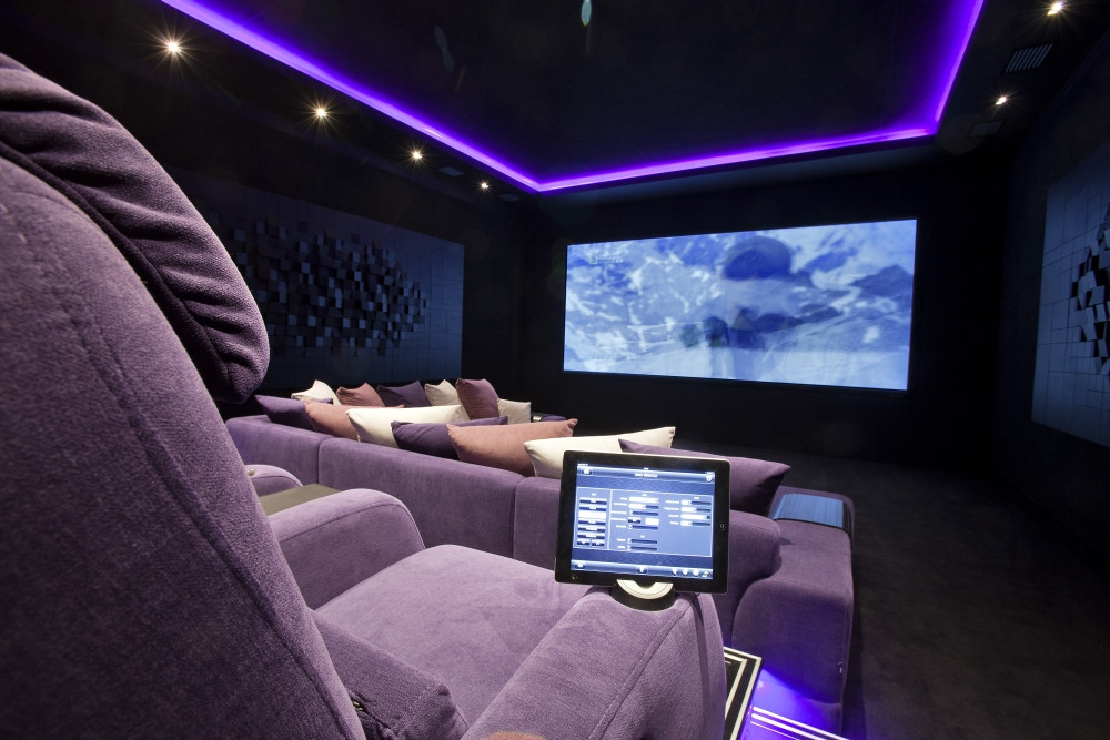 Wreszcie – część najważniejsza, do której prowadzą wyciszone drzwi. Tak jak wymagał tego inwestor, w pomieszczeniu wyeliminowano wszelkie akustyczne niedoskonałości przy pomocy pochłaniających paneli akustycznych. W rogach umieszczono pułapki basowe, zaś podłogę pokryto specjalnym materiałem. Zastosowanie systemu Crestron pozwala na integrację z pozostałymi częściami domu i z kina można sterować oświetleniem, systemami bezpieczeństwa, zarządzania energią i monitoringu – wszystko sterowane ze zindywidualizowanego interfejsu użytkownika.