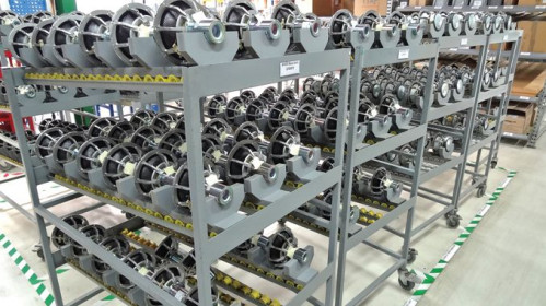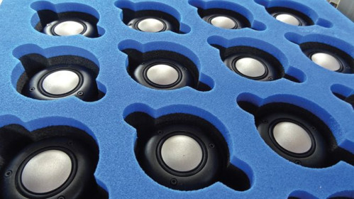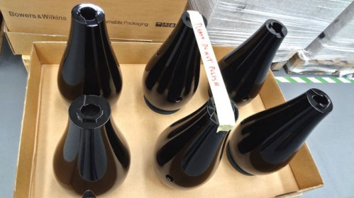Przygotowane do montażu głośniki niskotonowe (na pierwszym planie) i nisko-średniotonowe (na trzecim i czwartym wózku) zostały wyprodukowane w innej fabryce B&W.