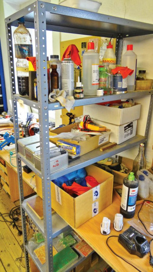 Regał z chemią – ten pozorny bałagan, brudne słoiki, butelki i inne naczynia najlepiej dowodzą, że jesteśmy w autentycznej fabryce. Do produkcji potrzebne są różne kleje, rozpuszczalniki, lakiery i substancje nasączające.
