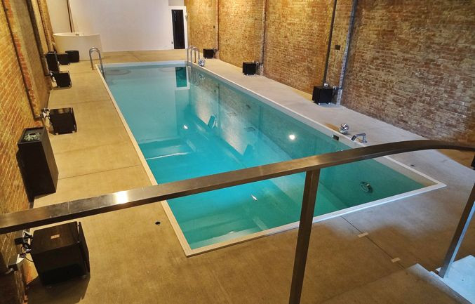 Basen też można wyposażyć w dobry sprzęt, chociaż trudniej tu będzie o dobrą akustykę. Na ścianach zespoły głośnikowe McIntosha, na podłodze subwoofery Sumiko.