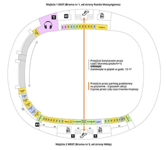 Przypominamy, że przejście pomiędzy salami znajdującymi się na trybunie wschodniej i zachodniej PGE Narodowego jest zamknięte przez cztery pierwsze godziny otwarcia wystawy, czyli w piątek pomiędzy godz. 13:00 a 17:00 (droga ta prowadzi przez część biurową, działającą w piątek do godz. 17:00). Dlatego do godz. 17:00 (tylko w piątek) przej- ście z jednej trybuny na drugą wymaga zjechania windą na poziom ulicy (do wejścia) i przejścia przez parking podziemny (pod płytą stadionu). W sobotę oraz niedzielę nie będzie już takich "atrakcji" - bezpo- średnie przejście będzie otwarte przez cały dzień (patrz mapka).