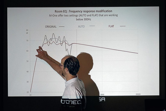 Głównym projektantem M-One jest Cedric Leon; właśnie objaśnia zasadę działania systemu M.A.R.S., pokazując przykładowe charakterystyki (bez korekcji - z korekcją Auto - z korekcją Flat).