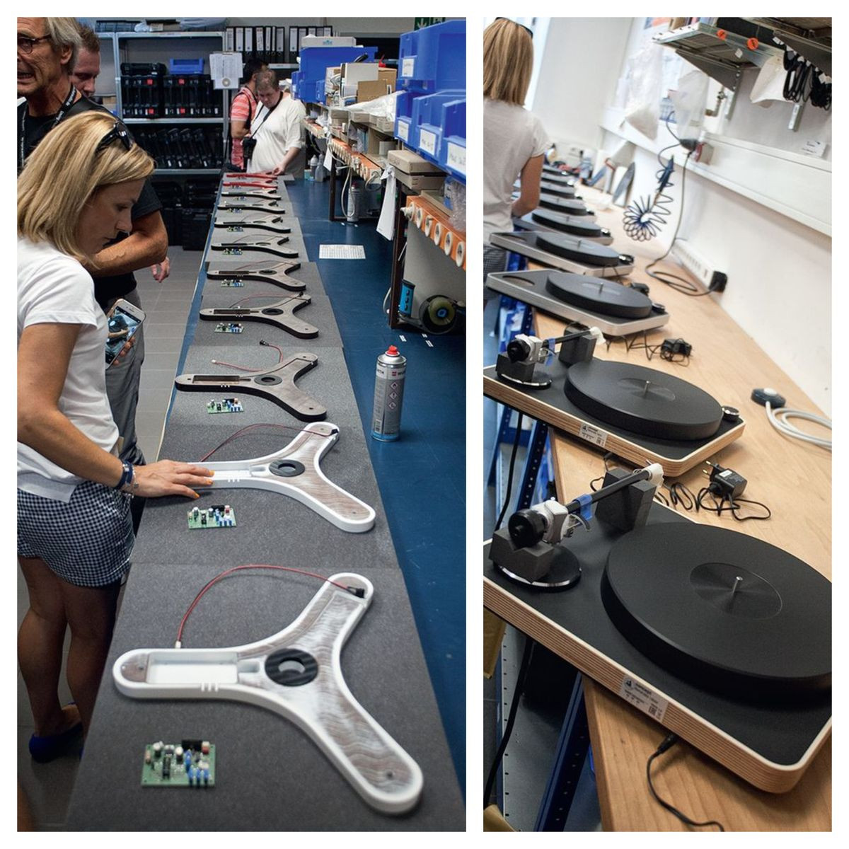 Dzień zaczyna się od przygotowania podzespołów, plinty są układane na stołach, w zasobnikach ramiona, silniki, łożyska. Do montażu jednego z tańszych modeli - Concept - wydzielono specjalną salę z ponad 20 stanowiskami. Montaż każdego egzemplarza trwa cały dzień, pod koniec każdy podlega indywidualnej kalibracji, obejmującej nie tylko tak oczywiste kwestie, jak geometria wkładki czy odległość pomiędzy osią talerza a kolumną ramienia.