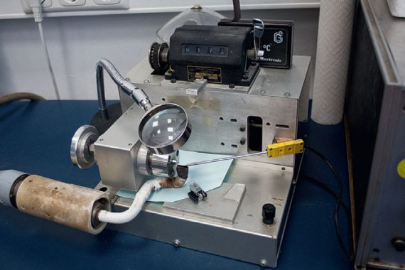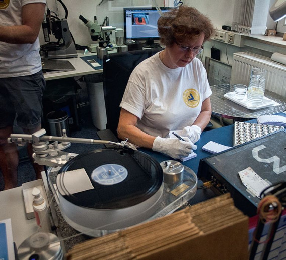 Chociaż maszyna do nacinania dysków nie jest w bieżącym użyciu, to udaje mi się trafić na pudła pełne "czystych" nośników. Mają one średnicę nieco większą niż 12", a warstwy zewnętrzne to rozbiegówki służące testom i kalibracji. W przeciwieństwie do taśmy, można, a nawet trzeba, wykonać na nich próbny zapis. Jednym z narzędzi pozwalających ocenić jego poprawność jest, będący częścią VMS80, mikroskop.