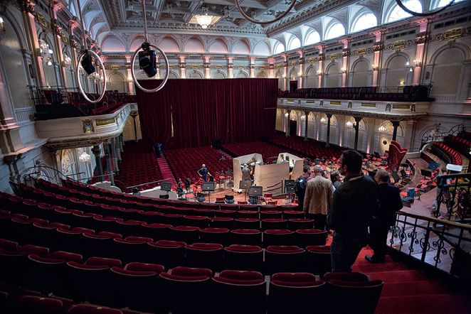 Schody po prawej stronie prowadzą wprost na scenę, na której właśnie zakończyła się próba. W oddali widać płachty zwisającej z sufitu czerwonej tkaniny. To element tłumiący