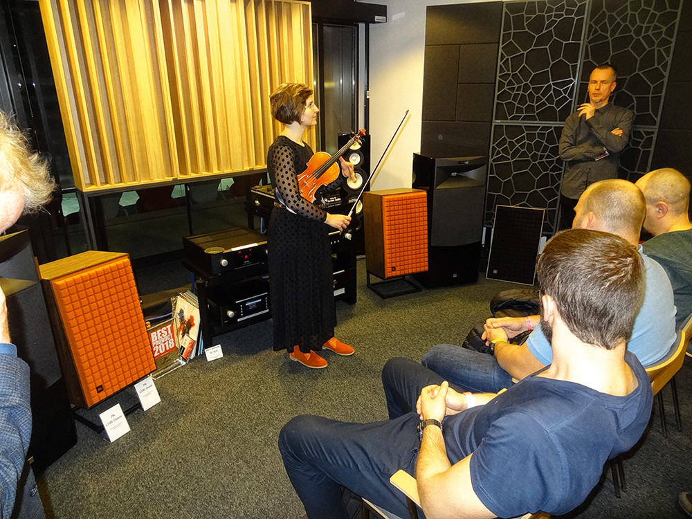 Jedna z najbardziej intrygujących i przekonujących prezentacji. "Kultowa" konstrukcja JBL-a, L100, została zrewitalizowana i po koniecznych modyfikacjach, ale przy zachowaniu podstawowych założeń konstrukcyjnych, wprowadzona niedawno do sprzedaży jako L100 Classic. Ponieważ zachowano oryginalną formę obudowy, typową dla konstrukcji sprzed kilkudziesięciu lat, więc wymaga ona, dla ustalenia właściwego kierunku promieniowania, podstawek i lekkiego pochylenia do tyłu; jest jednak dość niepozorna, więc aby wyglądała bardziej efektownie i nowocześnie (a na wystawie zwracała na siebie większą uwagę), można ją kupić z awangardowymi, pomarańczowymi maskownicami (wciąż piankowymi - jak drzewiej bywało; wersja czarna też jest dostępna). To firmowy kolor JBL-a, do którego chyba nieprzypadkowo dopasowane są buty skrzypaczki, pani Anny Hara-Pióro. Porównywaliśmy wykonanie na żywo z tymi samymi utworami, odtwarzanymi z pary L100 Classic... Rewelacja, mimo wszelkich różnic, a największą było to, że dźwięk z głośników biegł „z dołu”, i tutaj trzeba stwierdzić, że obowiązujący już od wielu lat schemat, w którym dźwięk biegnie z wysokości ok. metra, jest znacznie lepszy, niż ten sprzed pół wieku. Nic jednak nie stoi na przeszkodzie, abyśmy uszykowali sobie znacznie wyższe podstawki (już niepochylone) i w ten sposób problem rozwiązali. Dźwięk L100 Classic jest mocny, gęsty, ale czysty i wyrazisty. I wcale nie jest "archaiczny"... może poza tym kierunkiem, z którego biegnie.