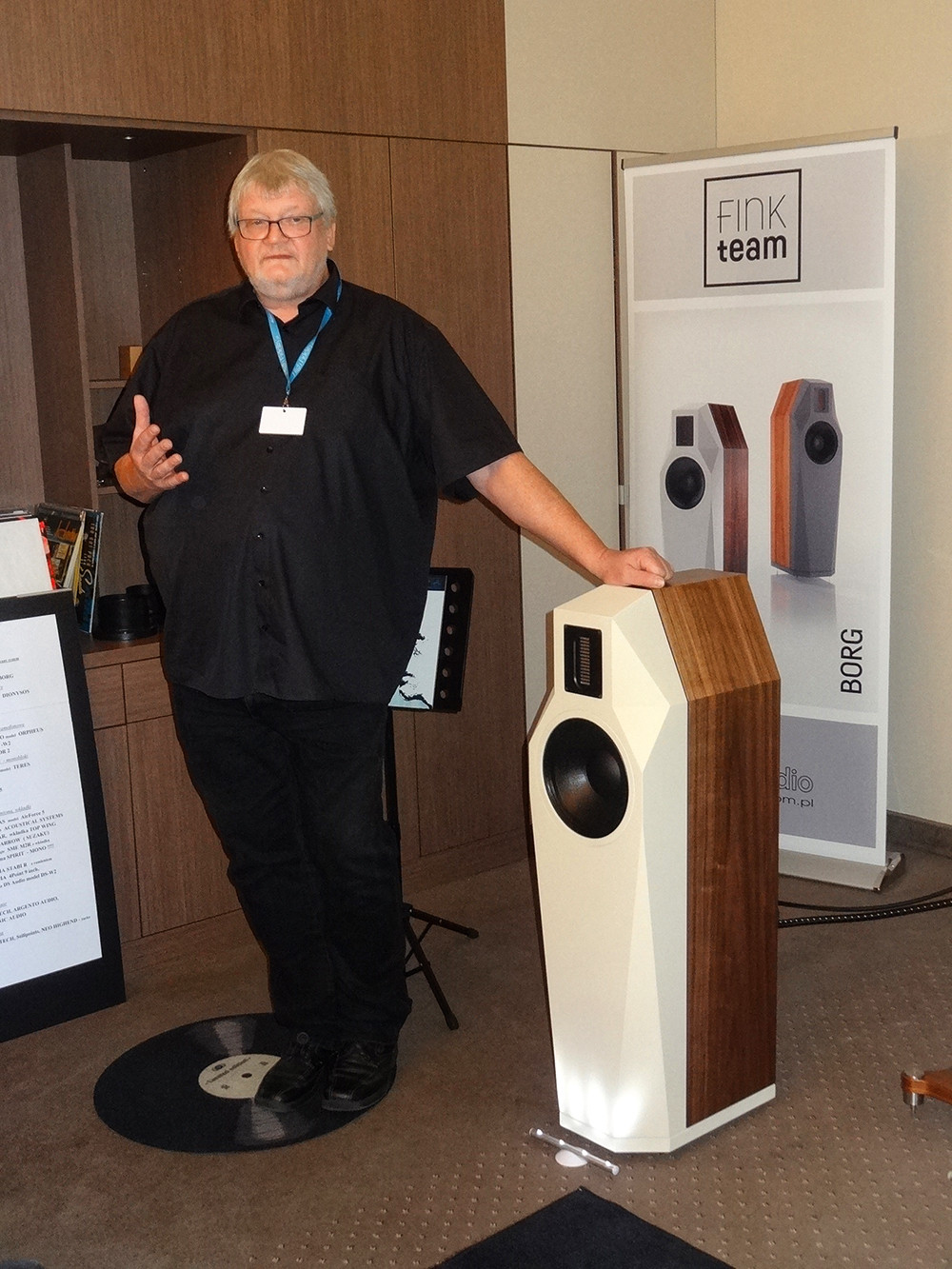 Fink Team, czyli Karl-Heinz Fink i jego drużyna, pojawił się w Polsce wraz z nową konstrukcją Borg (opisywaną już w relacji z Monachium); dystrybutorem została firma RCM, czyli Roger Adamek (i jego drużyna). KHF zrobił wykład, i chociaż ograniczył go w stosunku do tego, co można było usłyszeć w Monachium, to i tak większość niewiele z tego zrozumiała, ale wszyscy byli pod wrażeniem (przerażeniem). Chcecie spróbować? Temat wykładu: Wpływ rezystancji szeregowych, ze szczególnym uwzględnieniem rezystancji cewki w filtrze dolnoprzepustowym, na dobroć układu rezonansowego głośnika w obudowie, ze szczególnym uwzględnieniem systemu bas-refleks, w związku z różnymi rezystancjami wyjściowymi wzmacniaczy (których stosunek do impedancji obciążenia określa tzw. współczynnik tłumienia - po odwróceniu ułamka), i optymalna metoda dopasowania odpowiednich parametrów wzmacniacza i głośnika niskotonowego, dla uzyskania założonej charakterystyki częstotliwościowej i impulsowej, z uwzględnieniem różnicy w kosztach między miedzią (stosowaną w cewkach) a układami magnetycznymi (głośników), przy założeniu stosowania cewek powietrznych (dla ustalenia najniższych zniekształceń). Czyli? Taniej jest powiększyć magnes w głośniku, niż grubość drutu w cewce filtra. A najlepiej jest przygotować regulację pozwalającą pracować układowi rezonansowemu przy różnych dobrociach, odpowiednich do współczynnika tłumienia akurat podłączonego wzmacniacza. I tak właśnie działają Borgi...