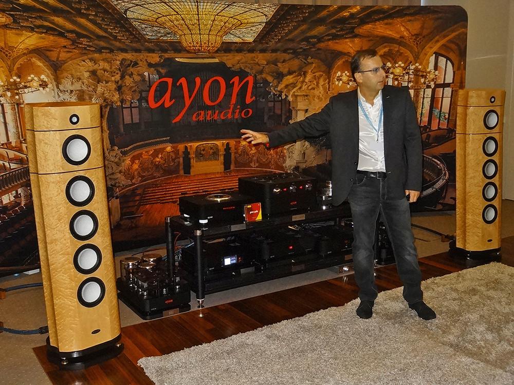 Kompletny system Ayona prezentował sam Gerhard Hirt. Słusznie wskazuje na kolumny (nowy model - Black Crane), one wciąż są najważniejsze... Muzyka płynęła ze "zwykłych" płyt CD (na co też Gerhard zwrócił uwagę), które okazały się zupełnie wystarczające.