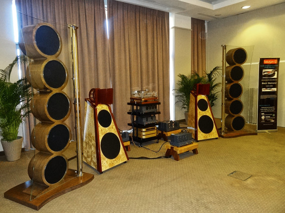 Na wystawie nie było wielu konstrukcji z otwartymi odgrodami, ale nieliczne łatwo już było zauważyć - to zwykle duże instalacje (na zdjęciu - kolumny na skrajach), których jednak nie należy pomylić z potężnym dźwiękiem; niska efektywność jest ceną za brak obudowy i mniejsze rezonanse.