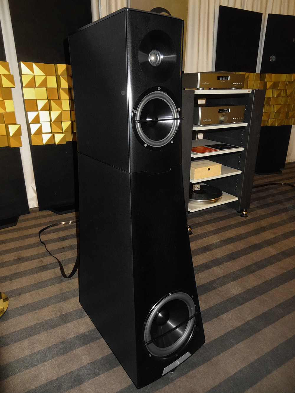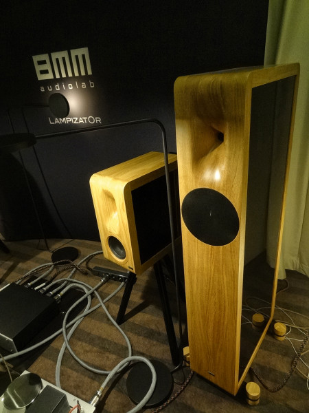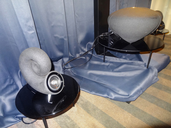 Przedstawiciel MBL-a Juergen Reis objaśnił konstrukcję i specyfikę działania 101 X-treme. Widoczna na zdjęciu część systemu (subwoofer stoi z tyłu, poza kadrem) jest trójdrożna, składa się z pary "cebul" dużych, pary małych, i pary malutkich (w centrum), tworzących układ symetryczny, o promieniowaniu dookólnym. Gra to fantastycznie normalnie. Gładko, przejrzyście, nienerwowo.