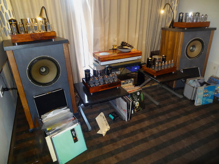 Kolumny firmy Destination Audio, model Nika - z 40-cm niskotonowym, tubą średniotonową (większa na górze) i wysokotonową (mniejsza poniżej). Z efektywnością 99 dB wychodzą naprzeciw potrzebom wzmacniaczy o niskiej mocy, tutaj z monoblokami Jadis SE845 (Single Ended, 20 W).