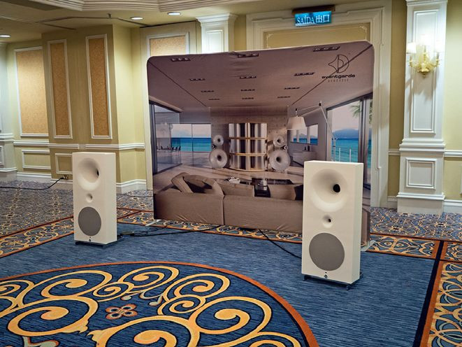 Avantgarde Acoustics Zero 1XD wystawiano w olbrzymiej sali. Źródło schowano za parawanem, podkreślając w ten sposób nowoczesność systemu.