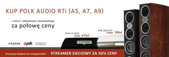 • W październiku w sprzedaży pojawią się ponadto promocyjne zestawy strumieniowe - do kolumn podłogowych Polk Audio RTi (A5, A7, A9) odtwarzacze strumieniowe VOCO V-Zone i Polk Omni P1 (do wyboru) dołączane są za pół ceny. Promocja będzie obowiązywać do końca listopada.