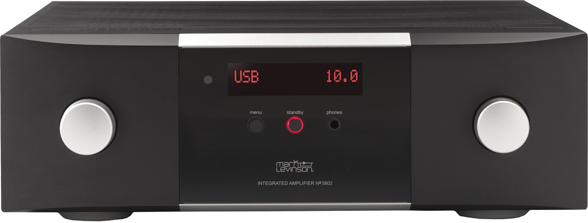 Anodowane na czarno panele przednie wykrojone z litego aluminium o grubości 25 mm, przechodzą niezauważalnie w elegancką szklaną powierzchnię zintegrowaną z wyświetlaczem, zamkniętą od góry i dołu dwoma poprzeczkami o naturalnej aluminiowej barwie. Fot. Mark Levinson No 5802