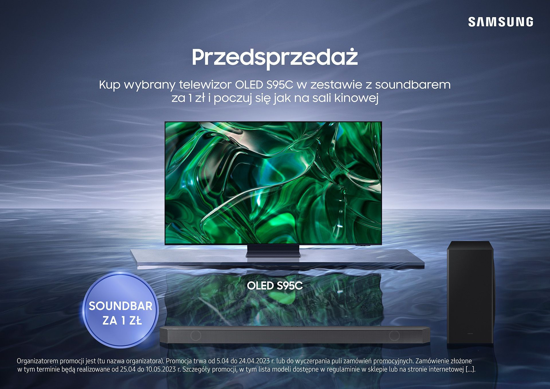 Samsung S95C w wersji 55 cali oferowany będzie z soundbarem HW-Q800B za 1 zł, a modele 65 i 77 cali z soundbarem HW-Q930B. Zamówienia w ramach przedsprzedaży można składać od 5 do 24 kwietnia 2023 roku. Wysyłka produktów rozpocznie się 25 kwietnia i potrwa do 10 maja 2023 r.