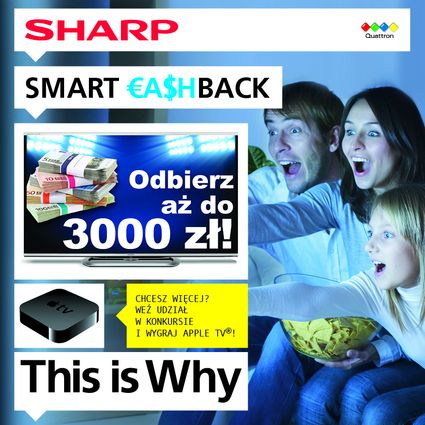 Klienci, którzy w czasie trwania promocji zdecydują się na zakup 60-, 70-, lub 80- calowego telewizora Sharp AQUOS LED 3D z technologią Quattron serii LE857E, mogą odebrać gwarantowany rabat w wysokości: 1000 / 2000 / 3000 zł (w zależności od wielkości ekranu wybranego telewizora). Na uczestników promocji czekają także nagrody - Apple TV®.