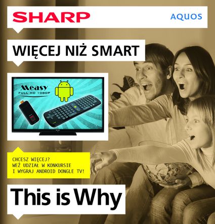 Promocja dotyczy wszystkich modeli telewizorów Sharp z aktualnej oferty, nieobjętych promocją SMART CASH BACK. Każdy, kto kupi telewizor Sharp i weźmie udział w konkursie, ma szansę na wygraną, jaką jest Android Dongle TV, dający nieograniczony dostęp do aplikacji na platformie Android.