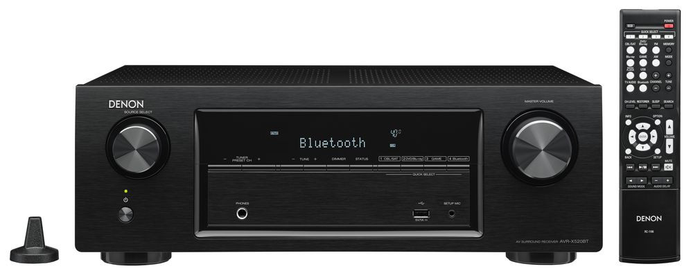 Denon AVR-X520BT jest wyposażony w pomiarowy mikrofon do konfiguracji audio, który dostosowuje krytyczne parametry systemowe do maksymalnej wierności dźwięku dla indywidualnego systemu głośników i przestrzeni w pomieszczeniu. Na panelu przednim znajdują się 4 przyciski szybkiego wyboru funkcji, które pozwalają wybrać jedno z ulubionych źródeł.