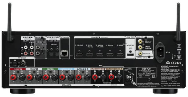Denon AVR-X1200W oferuje 7 kanałów - każdy po 145W. Został ponadto wyposażony w dekoder Dolby Atmos (dzięki niej możliwe jest również uzyskanie konfiguracji głośników odtwarzających dźwięk 5.1.2) oraz system Dolby Surround. Współpracuje z systemami DTS:X i DTS Neural:X.