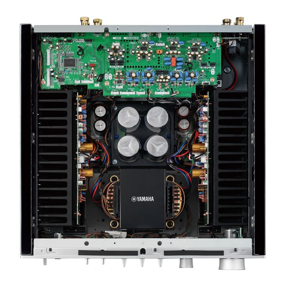 Yamaha A-S1100 wykorzystuje oryginalny transformator z rdzeniem EI, starannie dopracowany pod kątem optymalnej kompatybilności z ramą. Transformator przymocowany jest za pośrednictwem mosiężnych podkładek, ograniczających wewnętrzne wibracje, które mogłyby wpływać na jakość dźwięku. Z kolei cztery kondensatory blokowe o dużej pojemności, umieszczone w karbonowych osłonach, gwarantują pełne energii brzmienie, nawet przy wysokim poziomie głośności.