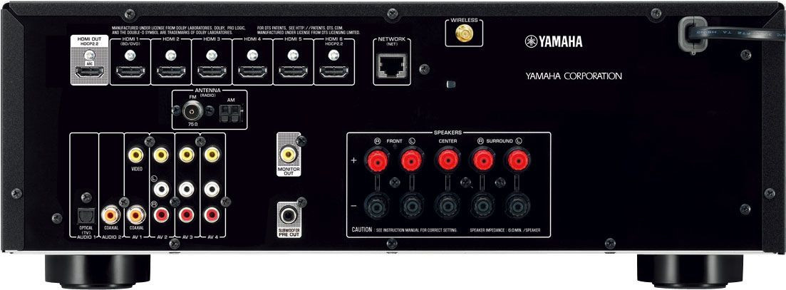 Yamaha RX-V479 jest wyposażona w 6 wejść/1 wyjście HDMI, z których 1 wyjście/1 wejście są zgodne ze standardem zabezpieczenia HDCP 2.2. Złącza HDMI i port USB na przednim panelu pozwalają podłączyć m. in. iPoda / iPhone`a lub pamięć USB.