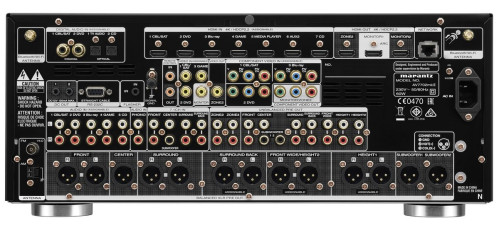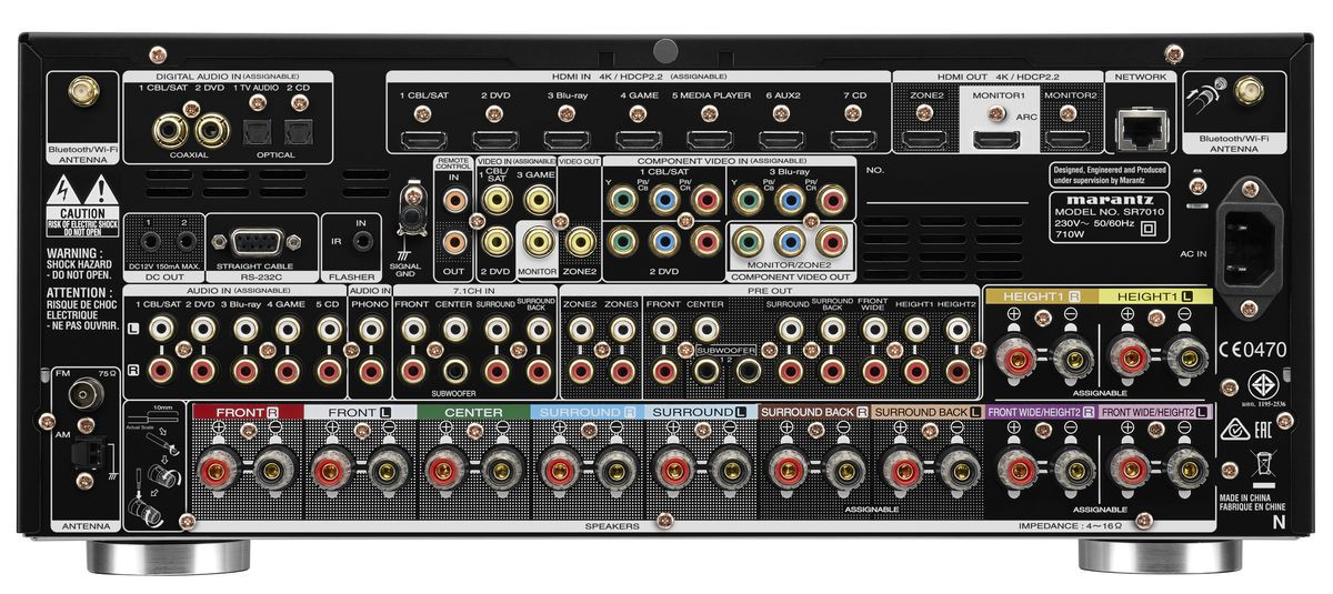 Amplituner Marantz SR7010 ma dziewięć kanałów o mocy 200 W na każdy z nich i oferuje 11.2-kanałowe przetwarzanie. Pozwala dodatkowo utworzyć konfigurację Dolby Atmos – przy dźwięku do 7.1.4 lub 9.1.2 (wymagany dodatkowy wzmacniacz) i DTS:X do 11 kanałów.
