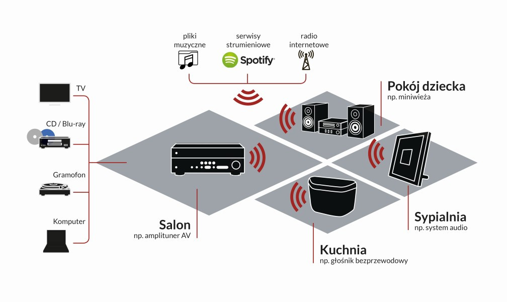 Użytkownicy mogą korzystać ze wszystkich urządzeń MusicCast niezależnie od siebie bądź też łączyć je bezprzewodowo, tworząc strefy odtwarzające tę samą muzykę. System zapewnia przy tym dowolność w korzystaniu z różnorodnych źródeł dźwięku. MusicCast może odtwarzać w najwyższej jakości sygnał wielu cyfrowych źródeł, takich jak smartfon, tablet czy laptop, a także serwisy typu Spotify, radio internetowe, dźwięk telewizyjny czy też pliki muzyczne z komputera lub innych nośników. Na tym jednak nie koniec - system jest w stanie zintegrować w bezprzewodowej sieci, także dowolne analogowe źródła jak gramofon, magnetofon czy nawet leciwy magnetowid VHS.