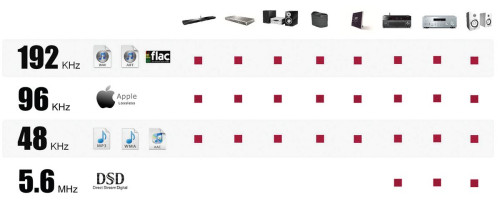 Dla materiałów ALAC parametry ograniczono do 24 bitów i 96 kHz. MusicCast będzie także wspierał nagrania DSD w wersji DSD64 (5,6 MHz), ale taką możliwość zarezerwowano dla trzech grup produktów: sprzętu stereo (wzmacniacze, odtwarzacze, amplitunery), A/V (amplitunery, procesory) oraz kolumn aktywnych. Oprócz plików z różnorodnych źródeł, Yamaha MusicCast wspiera także protokół Apple AirPlay oraz kodowanie apt-X w ramach Bluetooth.