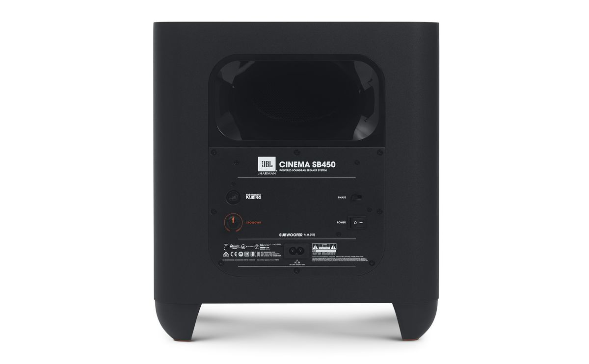 JBL SB 450 ma na pokładzie 8-calowy bezprzewodowy subwoofer 200 W, który odpowiada za, według zapewnień producenta, potężny bas. Dialogi mają być przy tym czyste, wyraziste, a kontrola głośności reklam niepotrzebna.
