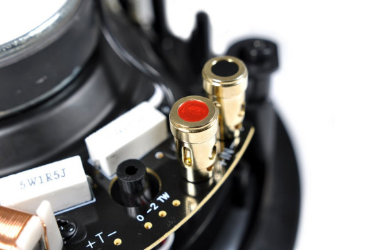 • Złocone samozaciskowe złącza dla kabli głośnikowych.