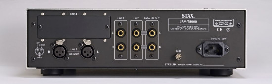 Stax SRM-T8000 został wyposażony w cztery wejścia RCA, RCA z przelotką, XLR oraz jedno na dzisiaj nie ustalone. Firma rozważa zainstalowanie przetwornika C/A lub wejścia gramofonowego.