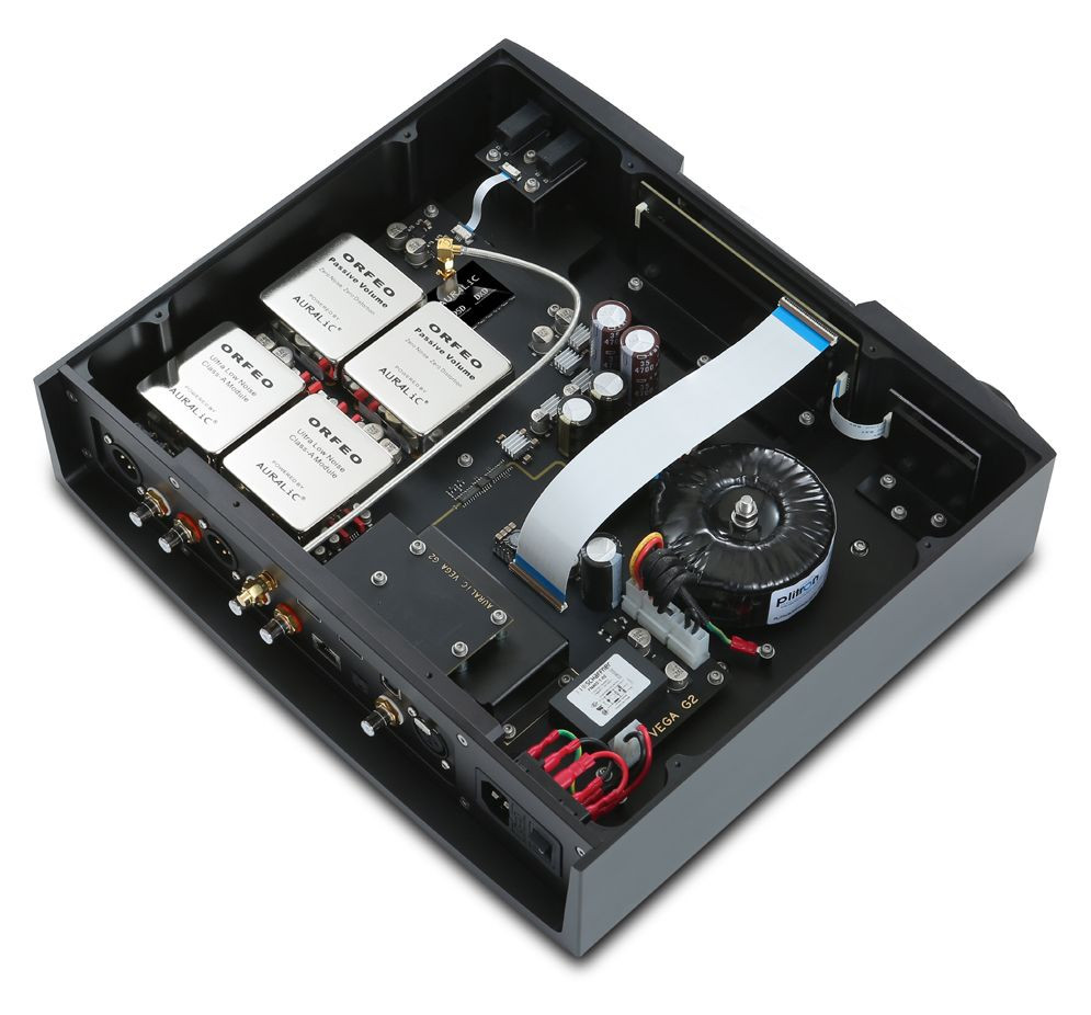 W pełni pasywna kontrola głośności to kolejna nowa funkcja pojawiająca się w VEGA G2. Opiera się ona na unikalnej sieci rezystorów drabinowych zbudowanej przez firmę AURALiC i pobiera dokładnie zerowy prąd po jej ustawieniu. Prąd zerowy jest równy zerowej interferencji i jest to kolejna innowacja VEGA G2. Wraz z modułem wyjściowym ORFEO klasy A, zainspirowanym klasycznymi projektami analogowymi, rezultatem końcowym jest niesamowicie wierny poziom prezentacji muzycznej.