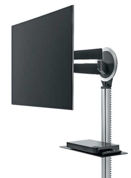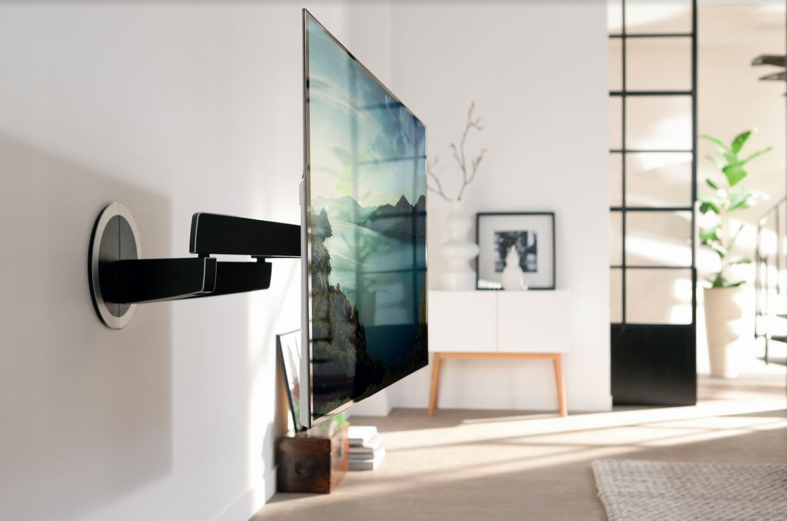MotionMount Next 7355 jest wyposażony w specjalny silniczek, dzięki któremu telewizor płynnie i cicho przesuwa się w przód i w tył oraz obraca się w zakresie do 120 stopni w prawo lub w lewo. Można ustalać pozycję telewizora na trzy sposoby. Najszerszą funkcjonalność zapewnia bezpłatna aplikacja dostępna w App Store i Google Play, która pozwala m.in. zaprogramować 10 pozycji do oglądania.