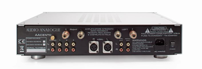 Audio Analogue AAcento ma też niezależny obwód wzmacniacza słuchawkowego (pracujący w klasie A). Moc urządzenia wynosi 2 x 100 W przy 8 Ω i dwukrotnie więcej przy 4 Ω.