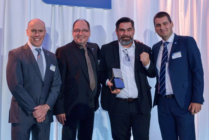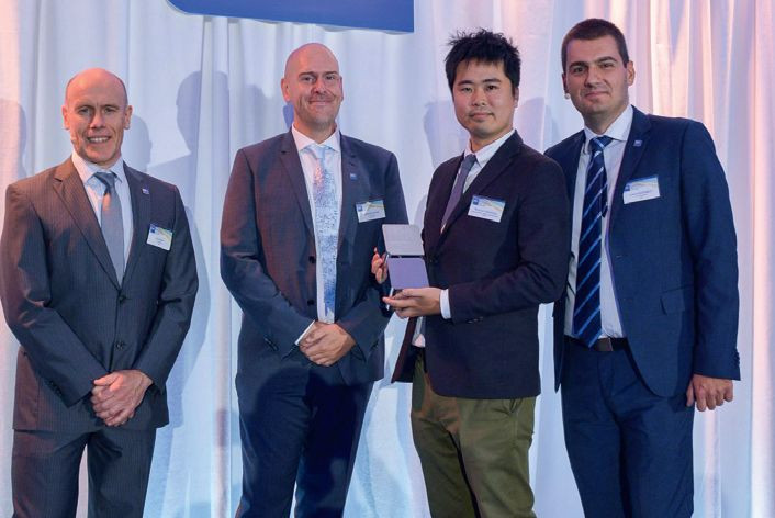 Przedstawiciel Denona, Yoshinari Fukushima (nagroda za słuchawki AH-D7200), w towarzystwie (od lewej) Paula Millera, Jammie Biesemanna (szef grupy ekspertów Hi-Fi) i Ljuby Miodragovica (wiceprezydent).