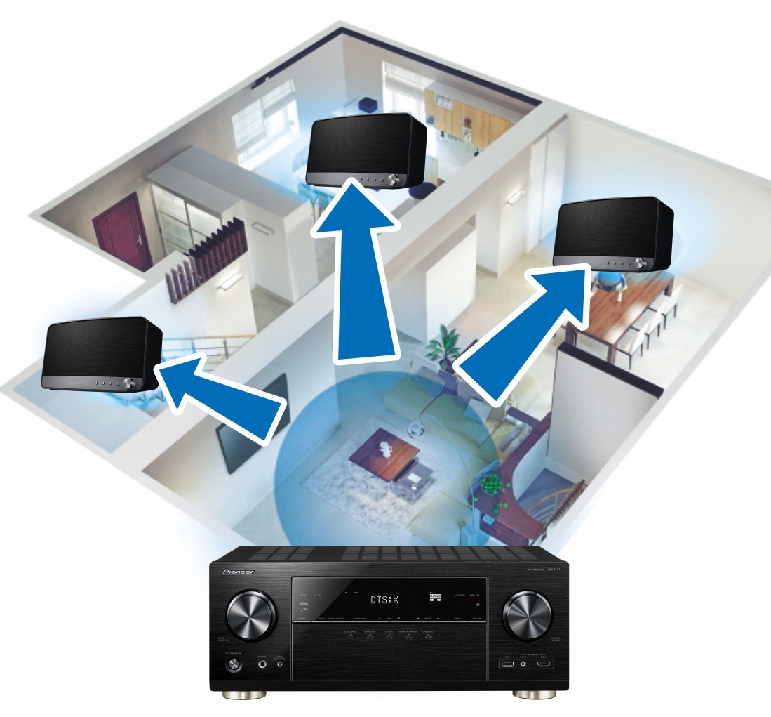 Technologia FlareConnect* dystrybuuje i synchronizuje muzykę ze źródeł podłączonych do sieci i zewnętrznych źródeł dźwięku (z wykorzystaniem dwuzakresowego pasma 5 GHz /2,4 GHz Wi-Fi®) między wybranymi urządzeniami audio-wideo firmy Pioneer i kompatybilnymi głośnikami bezprzewodowymi. Umożliwia to odtwarzanie nagrań LP, płyt CD, plików z sieciowych serwisów muzycznych na żądanie i innych źródeł muzycznych niezależnie od miejsca w domu.