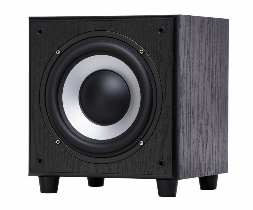 Obudowa subwoofera skrywa solidny przetwornik 8". Jak zapewnia producent, konstrukcja obudowy z MDF zapewnia doskonałej dźwięk niskich częstotliwości bez zniekształceń, a tunelowy system bass reflex maksymalny efekt basów.