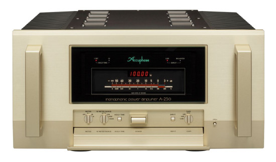 Od strony konstrukcyjnej Accuphase A-250 przedstawia się następująco -dwa rozmieszczone symetrycznie stopnie końcowe pracują w konfiguracji równoległej, dostarczając mocy ciągłej 100 W dla obciążenia 8 Ω i aż 800 W dla 1 Ω. W tym miejscu trzeba wspomnieć, że to tylko wielkości katalogowe, gdyż rzeczywiste wynoszą odpowiednio: 191 i 1009. W czystej klasie A.