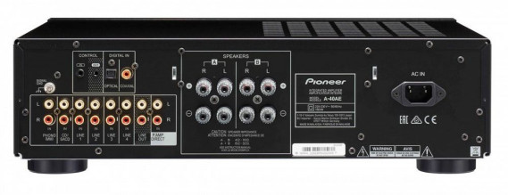 Pioneer A-40AE jest wyposażony w dwa zestawy wyjść głośnikowych (A, B), które mogą być używane osobno lub razem, a także wysokiej klasy przezroczyste zaciski głośników zapewniające niezawodne połączenie. Do dyspozycji są też optyczne i koaksjalne wejścia cyfrowe umożliwiające podłączenie telewizora lub innych odtwarzaczy audio i odbiór wysokiej jakości dźwięku. Wzmacniacz oferuje ponadto zacisk wejścia phono (MM), dzięki czemu podłączymy gramofon.