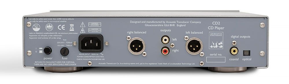Odtwarzacz CD ATC CD2 wypuszcza sygnał liniowy audio poprzez gniazda RCA oraz w pełni zbalansowane gniazda XLR. Wyjścia cyfrowe S/PDIF są dostępne w formie wyjścia współosiowego Coax i optycznego Toslink. Odtwarzacz ma 5 przycisków sterujących, których funkcje są zdublowane na pilocie zdalnego sterowania.
