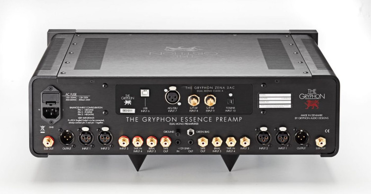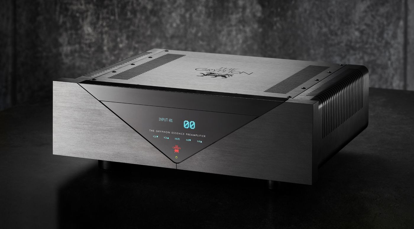 Pracujący w konfiguracji Dual Mono przedwzmacniacz liniowy Gryphon Essence został wyposażony w dwa zbalansowane wejścia XLR oraz trzy wejścia gramofonowe single-ended. Urządzenie to, w celu osiągnięcia referencyjnej jakości brzmienia, niemal w całości zostało pozbawione okablowania wewnętrznego, oprócz – rzecz jasna – najbardziej niezbędnych elementów. Dzięki temu inżynierowie Gryphona mogli pominąć wpływ kabli na brzmienie i w całości skierować uwagę na optymalizację brzmieniową poszczególnych modułów elektronicznych przedwzmacniacza.