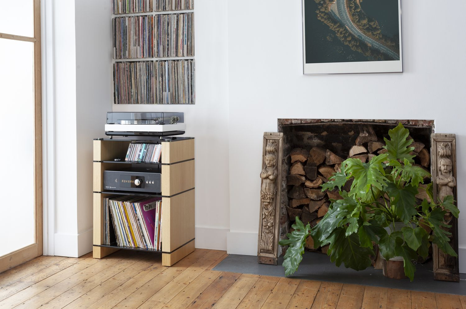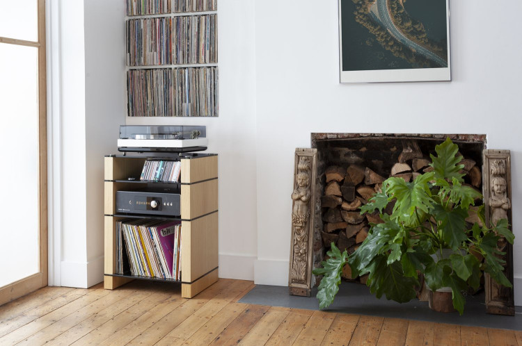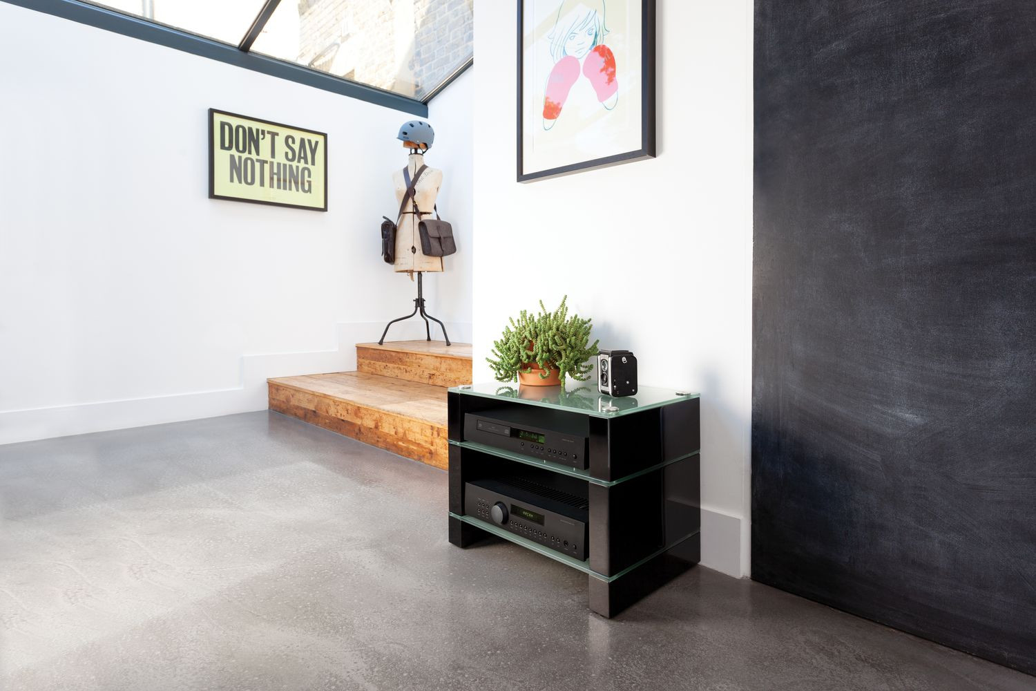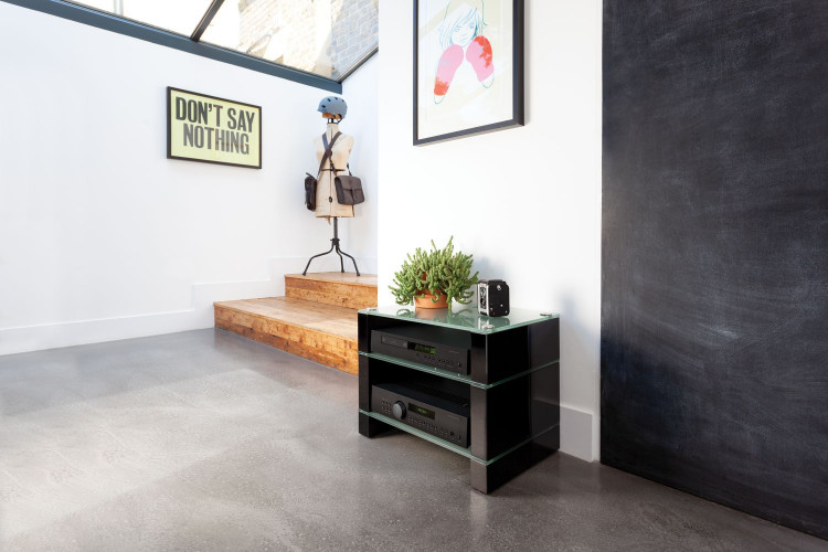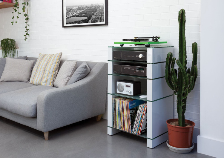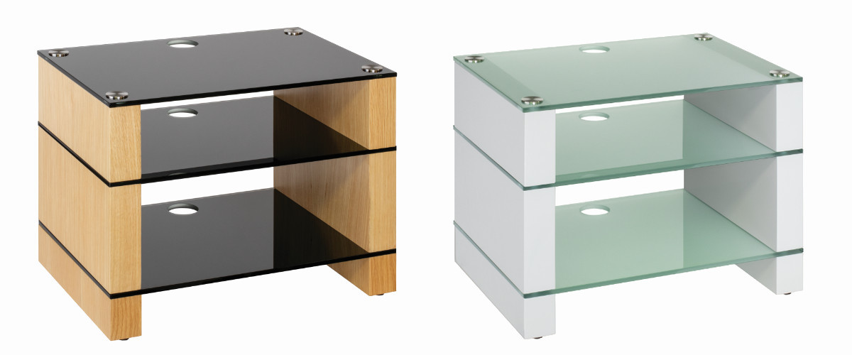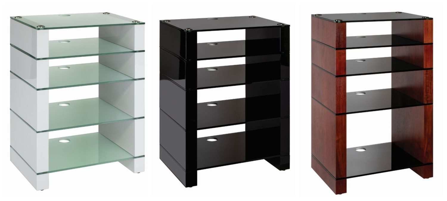 Seria mebli Stax powstała z myślą o przechowywaniu urządzeń hi-fi i audio-wideo. Oferuje duży wybór rozmiarów i rodzajów wykończenia. Tych ostatnich są cztery: czarny błyszczący, biały błyszczący, orzech i naturalny dąb. Półki ze szkła hartowanego są lakierowane na czarno lub wykończone metodą trawienia.