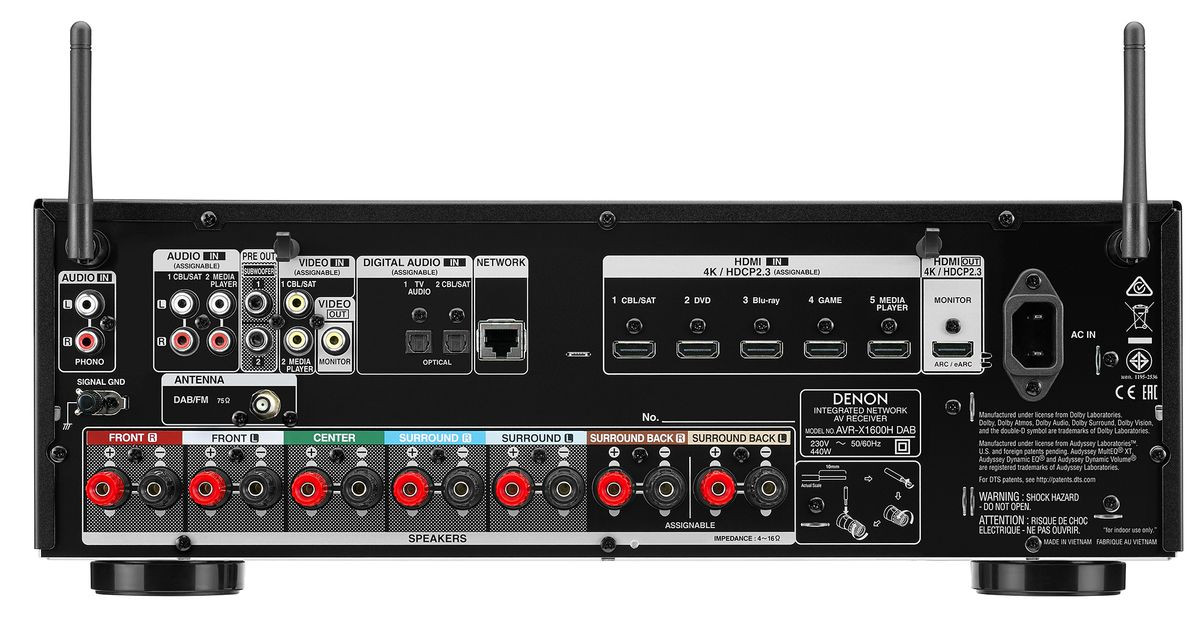 Dołączony konfigurator Quick Start Guide amplitunera Denon AVR-X1600H DAB zawiera proste, czytelne instrukcje, jak zacząć użytkowanie. Po podłączeniu telewizora do AVR-X1600H DAB za pośrednictwem HDMI na ekranie telewizora pojawi się asystent konfiguracji Denon Setup Assistant, który krok po kroku przeprowadza przez proces konfiguracji. Rząd terminali głośnikowych oznaczony kolorami jest ułożony poziomo, co ułatwia organizowanie i podłączanie przewodów głośnikowych.
