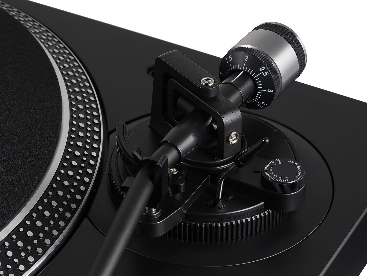 Gramofon Audio-Technica AT-LP120xBT-USB jest standardowo dostarczany ze stroboskopowym, antyrezonansowym talerzem odlewanym z aluminium (ze wskaźnikiem prędkości) i pokrytym filcową matą wytłumiającą oraz ze zbalansowanym ramieniem w kształcie litery S z hydraulicznie tłumionym mechanizmem podnoszenia/opuszczania i regulacją siły nacisku.