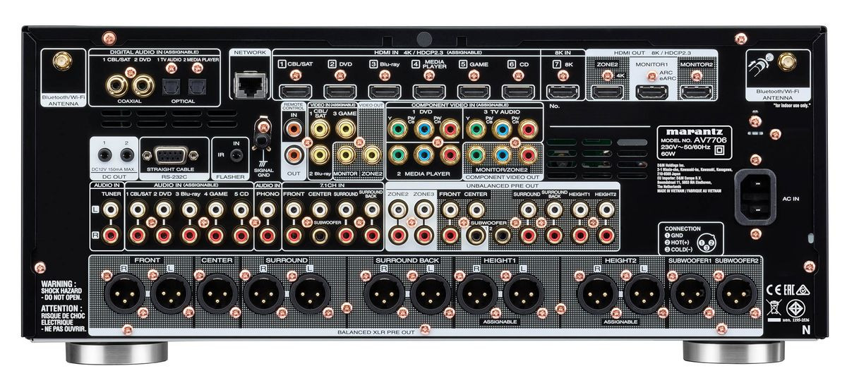 Marantz AV7706 oferuje nam osiem wejść i trzy wyjścia HDMI. Jedno wejście 8K obsługuje rozdzielczość 8K/60Hz oraz 4K/120Hz, podczas gdy wszystkie inne wejścia 4K/60Hz, 4:4:4 Pure Color sub-sampling, Dolby Vision, HLG, HDR10, 3D, BT 2020 oraz najnowszy standard ochrony przed kopiowaniem HDCP 2.3.