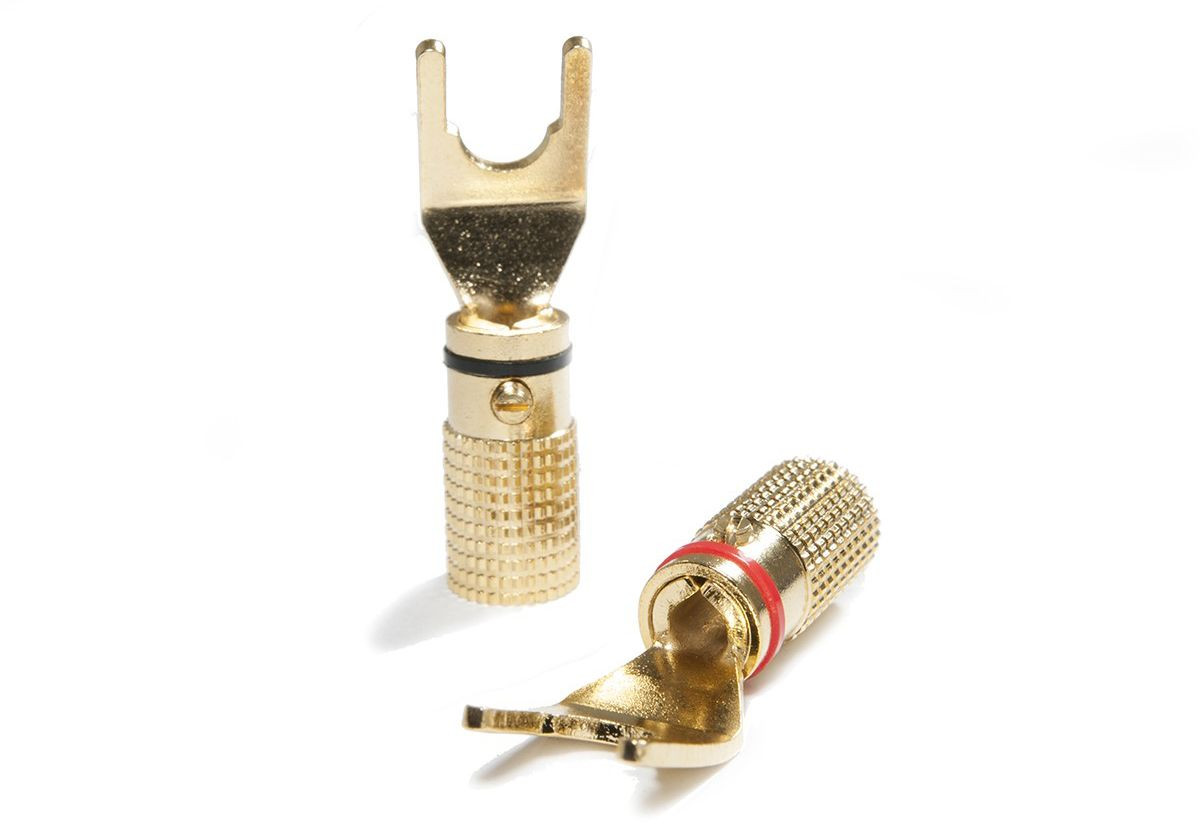Widły do montażu na kabel głośnikowy o przekroju do 4 mm². Wykonany w całości z metalu, zabezpieczony przed korozją pozłacaniem. Łatwy montaż na 2 śruby zabezpiecza go przed jakimkolwiek ruchem, a przy tym nie wymaga lutowania.