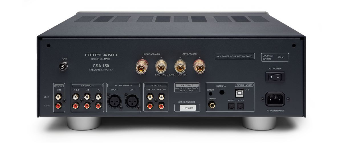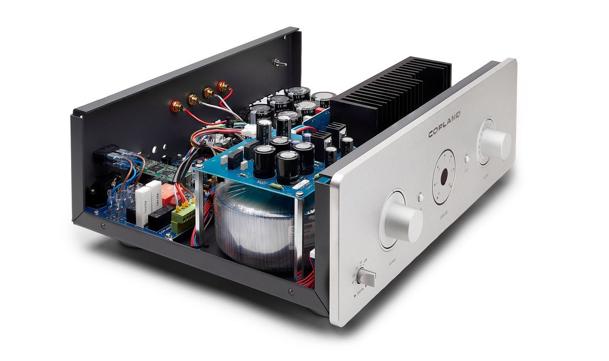 Obudowa Coplanda CSA 150 skrywa rzecz jasna przetwornik cyfrowo-analogowy. Moduł ten bazuje na 32-bitowym układzie ES9018 Reference w konfiguracji quad-mono, konfiguracji 8 mono do 2 stereo i udostępnia wiele wejścia S/PDIF oraz port USB. Całości dopełniają wejście gramofonowe z korekcją RIAA dla wkładek MM oraz opcjonalny moduł łączności bezprzewodowej Bluetooth z obsługą aptX HD.